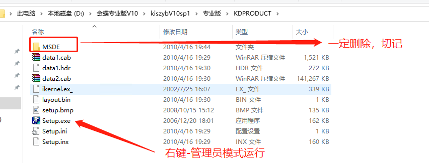 2、安装完以上数据库,下载我们的软件,然后解压,解压后得到目录kiszybV10sp1\专业版\KDPRODUCT\MSDE这个MSDE目录直接删除即可(这个是金蝶自带的SQL数据库精简版-财务切记用精简版),然后点Setup.exe右键-管理员模式运行,如下图