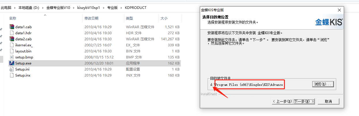 4、到了这步,选择路径的地方,建议更换路径前面的C为D,其他不变,如“D:\Program Files (x86)\Kingdee\KIS\Advance” 如下图所示