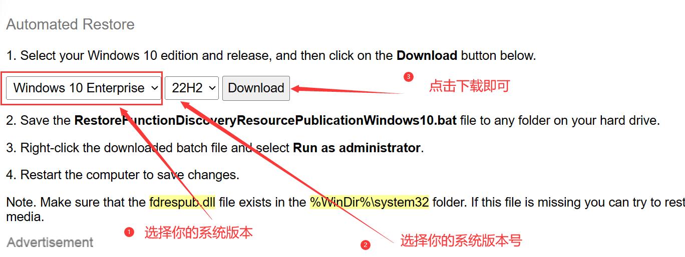 写在最后:确保该fdrespub.dll文件存在于%WinDir%\system32文件夹中;如此文件丢失,可尝试从 Windows 10 安装介质(安装光盘或者ISO文件)中恢复它即可;