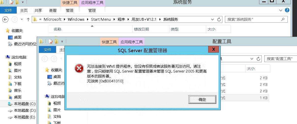 客户安装用友U8+12.1版本的时候,需要用到SQL配置管理器,然而启动SQL Server配置管理器“SQL Server Management Studio”出错,“无法连接到WMI提供程序,您没有权限或者该服务器无法访问。无效类0x80041010” 如下图所示