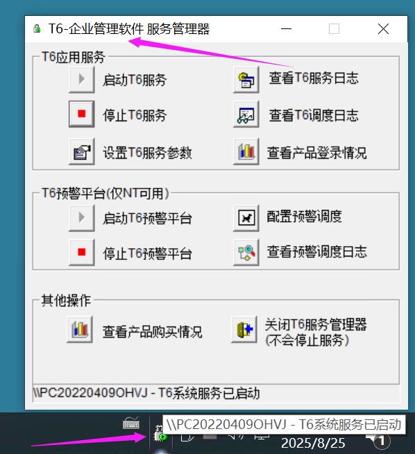 T6应用服务包括: 启动 T6 服务 、停止 T6 服务、设置 T6 服务参数、查看 T6 服务日志、查看 T6 调度日志、查看产品登录情况!