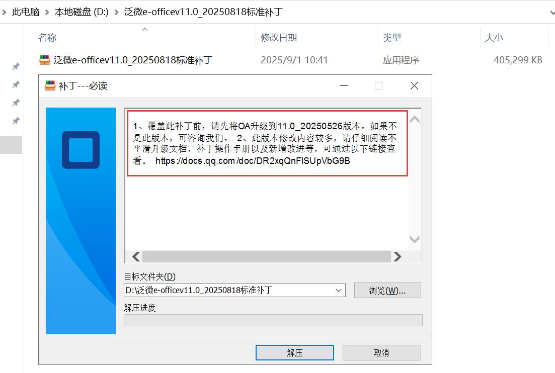 1、覆盖此补丁前,请先将OA升级到11.0_20250526版本。如果不是此版本,可咨询我们。