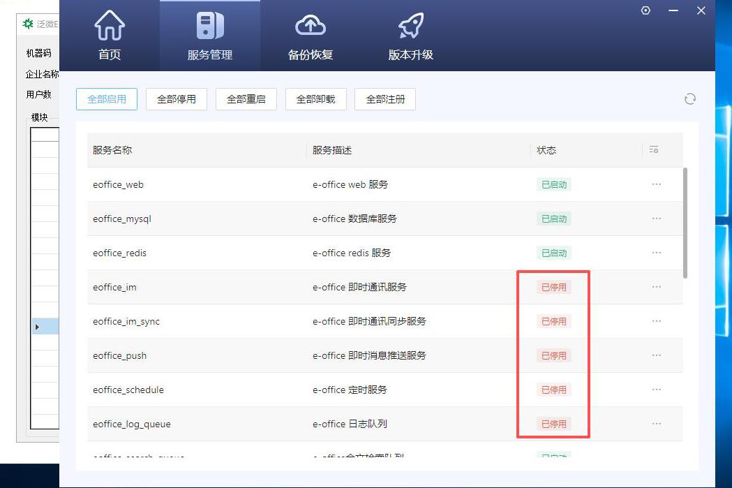 1、停止所有服务 2、卸载全部服务 3、覆盖所有文件 4、注册服务(手动注册“eoffice_redis”和“eoffice_mysql”别的可不要注册) 5、然后右键管理员模式update.bat升级(e-office_server_11.0\bin\update.bat) 6、全部服务注册